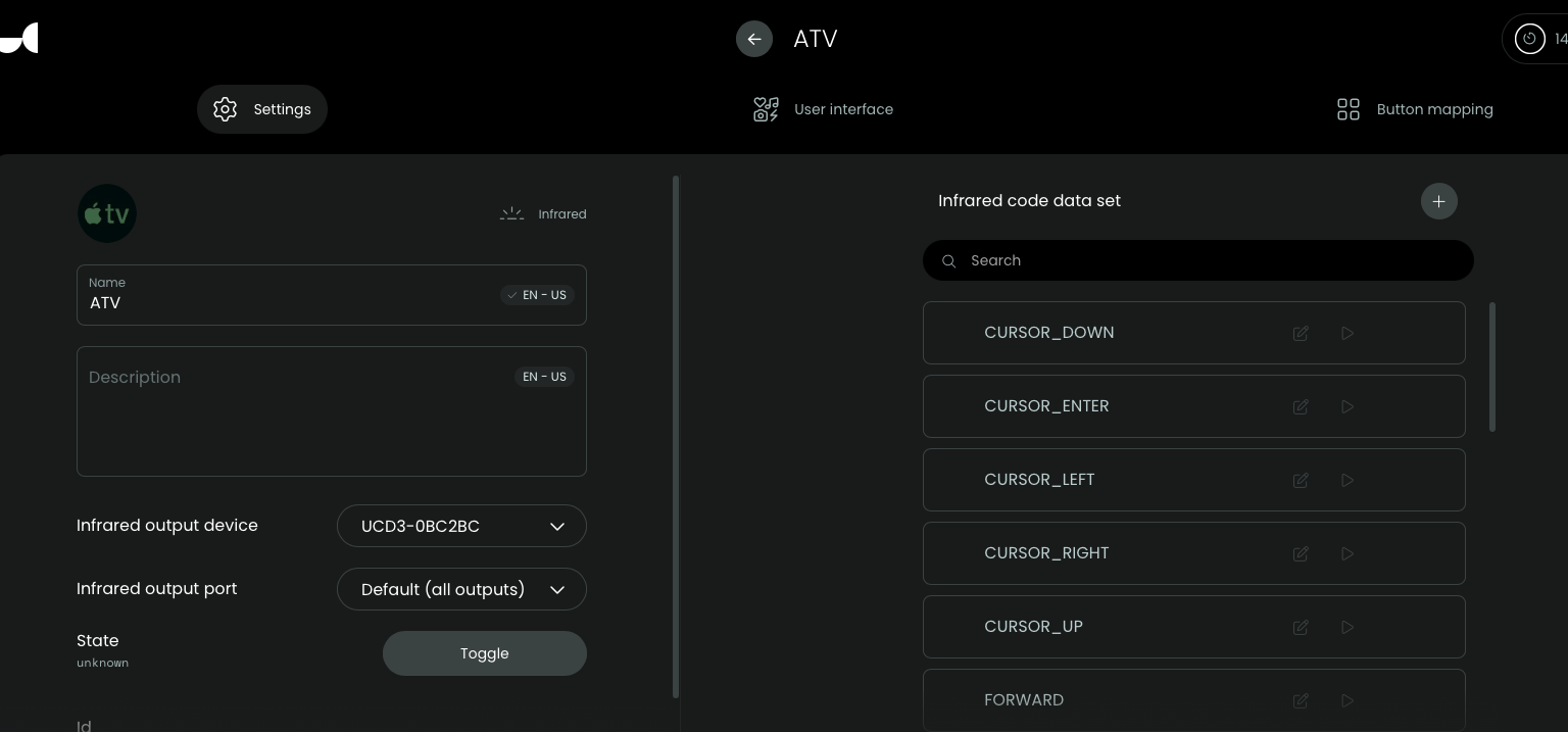 In the entity settings I see; Infrared output device: UCD3-0BC2BC Infrared outport port: Default (all outputs)