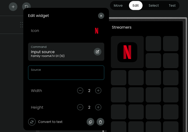 Supposedly for the AppleTV command ‘Input source” clicking in the source field is supposed to show a list of options (Netflix, Disney+, etc)