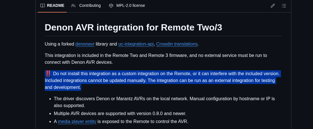 I have been trying to update my Denon integration using the Denon integration from GitHub. I used the custom install to add the integration. All good so far. I tapped the installed integration to run the setup. The setup runs successfully but there are no entities. What am I doing wrong?