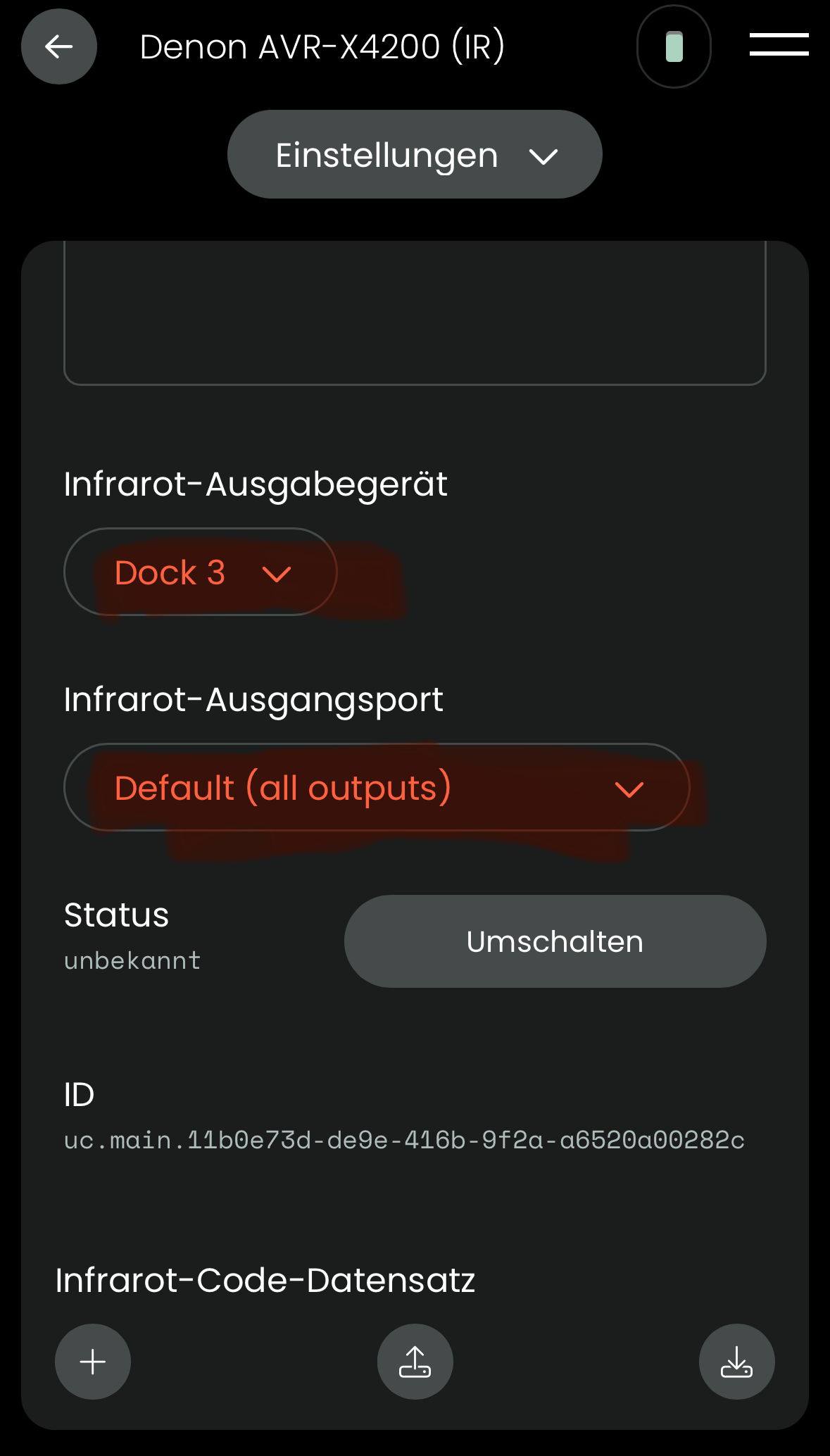 Leider ist es mir bisher noch mit keinem IR-Code gelungen, ihn der R3 beizubringen. Egal welche Fernbedienung/welches Gerät, ganz grundsätzlich immer kommt die Fehlermeldung am Dock, dass der Code nicht gelernt werden konnte. So natürlich auch beim AVR.