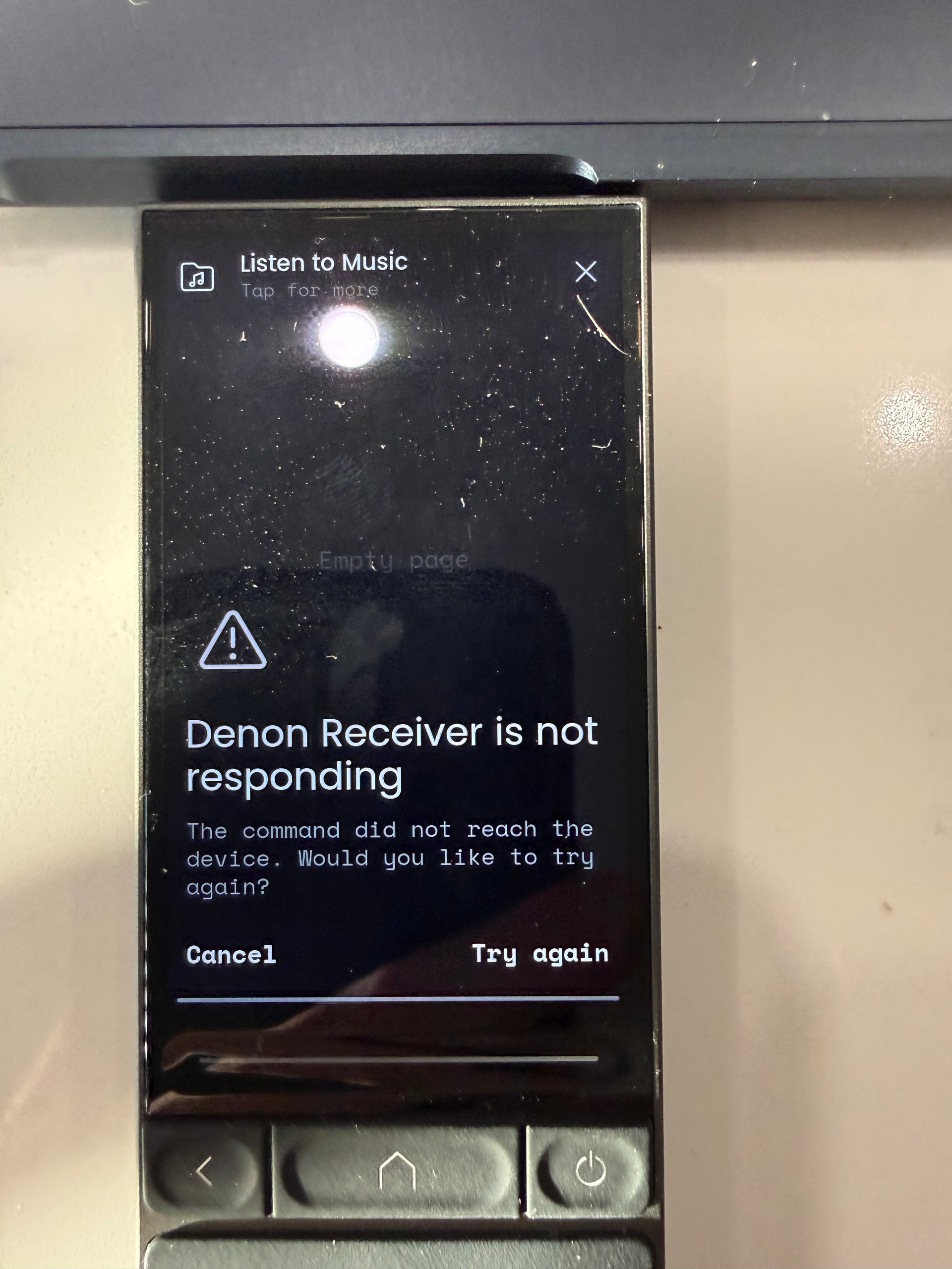 Other than the obvious (why does it have a problem sending an IR Command), I have to ask why it’s making me ACKNOWLEDGE that it didn’t work before I can send any other command. Effectively, it failed to send a command, and then makes matters worse for usability by demanding I acknowledge that it didn’t work. Would be much better to just let me hit the button again and hope the new attempt goes through. Instead, it’s making life harder adding in a step and making me think about it.