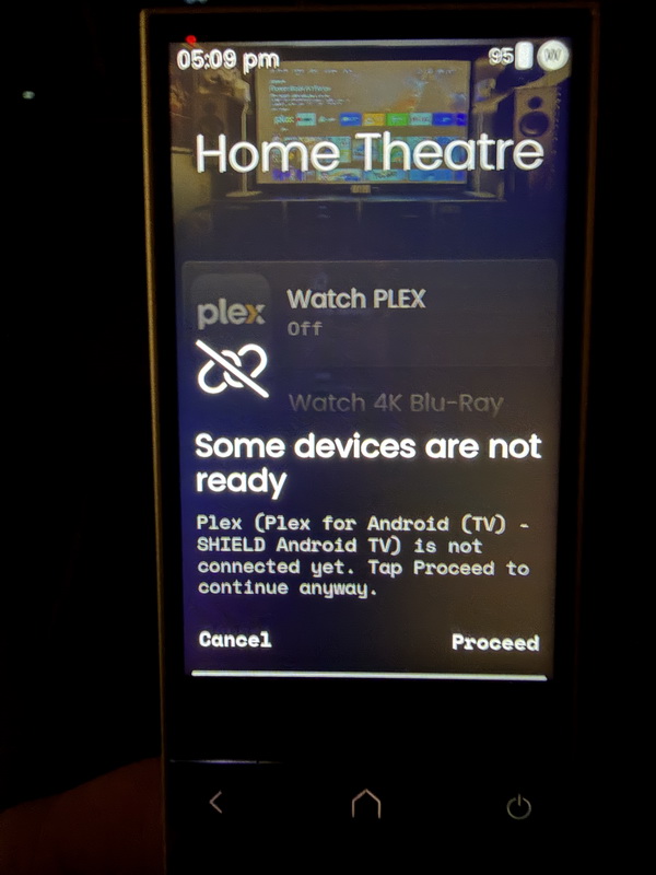 Hi all, so I’ve just upgraded from 2.7.0 to 2.8.3 on the R3 and been playing with all the new cool features like Denon Sensors and Voice Assistant in AndroidTV Integration and got it all working nicely. However, I noticed a new message when I start an activity with my HA Plex media player in it (which I use to get my Plex media artwork on my R3 remote) I get this “Some devices are not ready” message and when I hit Proceed - everything activates correctly and displays fine. It’s now an annoying extra step. Did the old 2.7.0 software just not check if this HA entity was available and the newer 2.8.3 does check before running the activity? Even though its says not ready, when I get into Plex and play the movie everything runs correctly. I don’t even know where to begin trouble shooting this. It displays my correct artwork in HA dashboard too. I still don’t get the timescale or times showing in R3 display though (I wonder if there’s something with this that it isn’t talking properly.