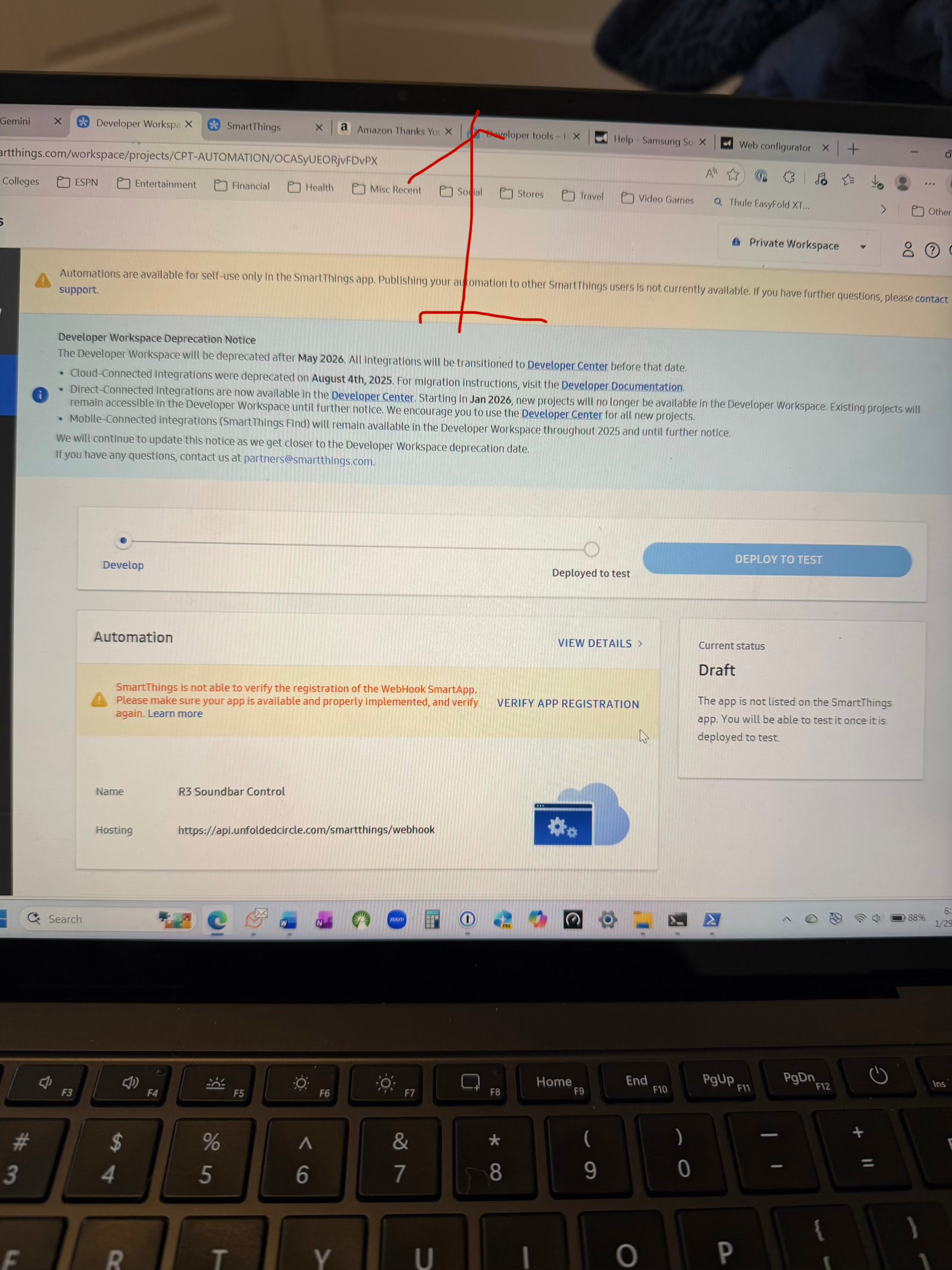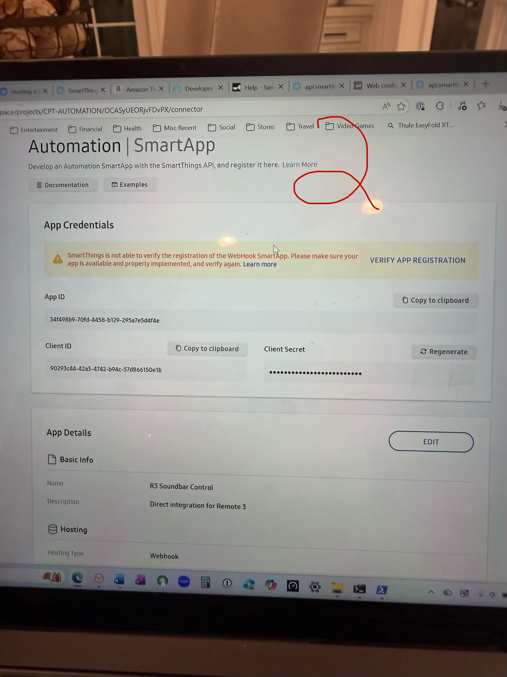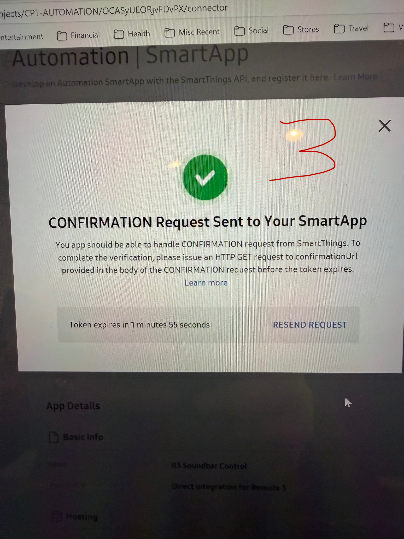 I’m going down two parallel paths trying to get this to work. One path is trying to get the R3 SmartThings integration to work. The attached screenshots are from the Developer Workspace. I’m unable to “verify” my app registration. Picture 1 shows the end of my project where I am unable to “deploy to test” because it needs to be verified. When I click “verify” here or in the “Automation Connector” (picture 2) I get the popup with a countdown (picture 3), but nothing happens. I’m sure I’m doing something wrong?