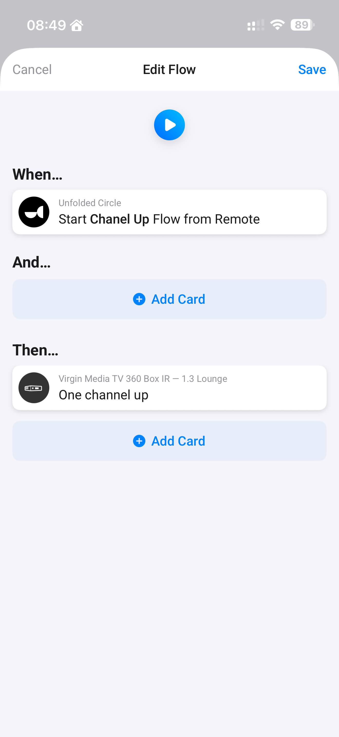 So using a Flow, just can’t get them to work at all. I create a flow with “channel up” and”channel down”. So I have a “when” card with “channel up” and that fires the IR device channel up (image) Doesn’t appear in the remote. I’ve restarted the remote, restarted Homey, removed the integration and app and added again. I’ve waited overnight, nothing.