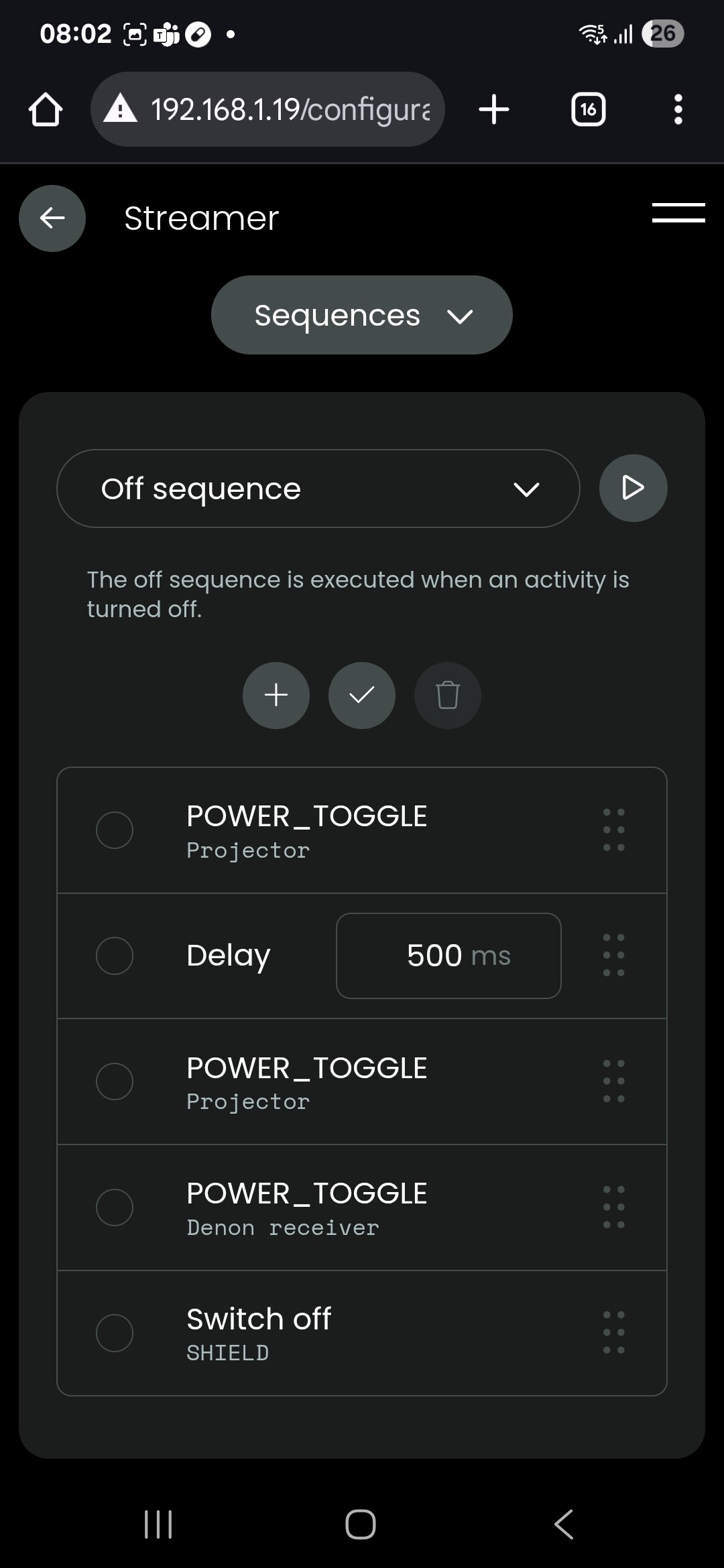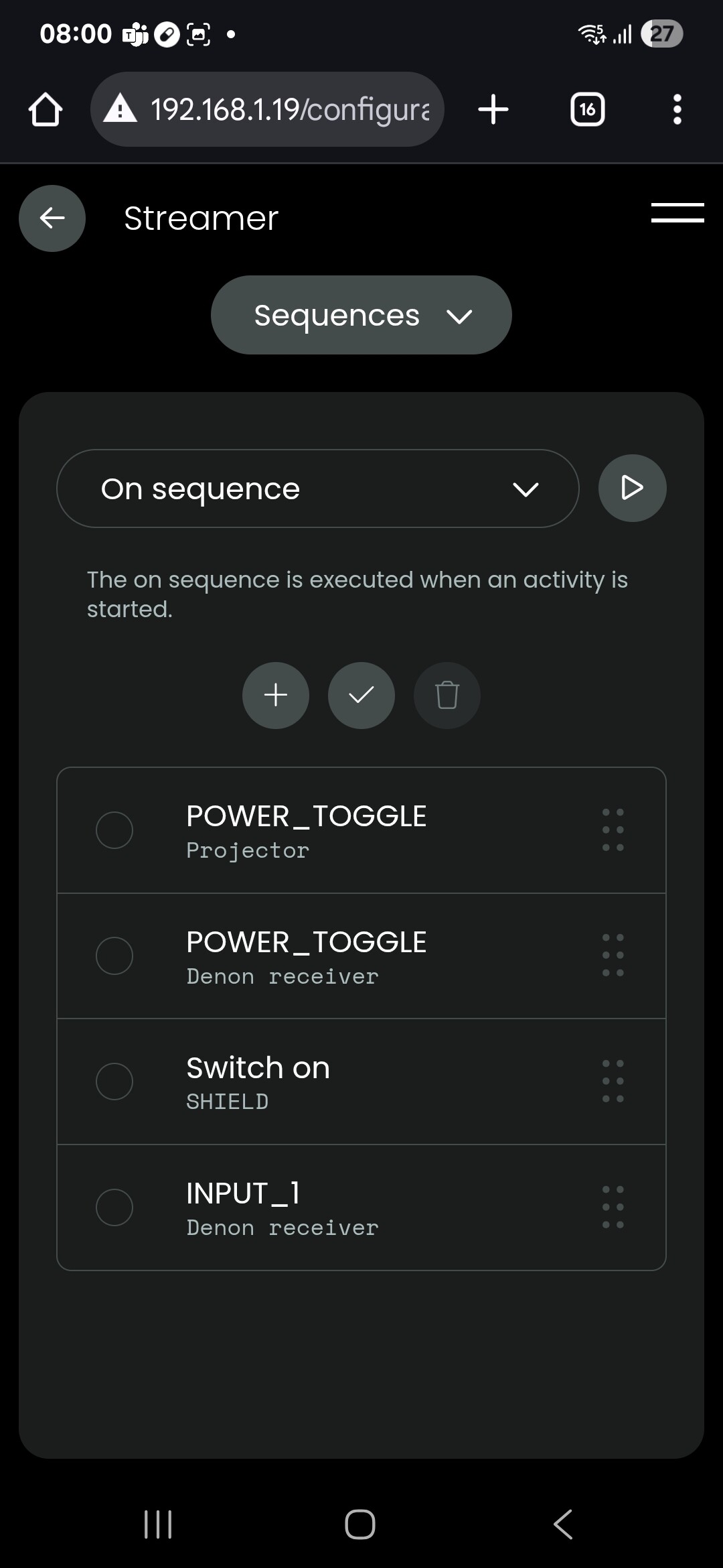 Also use dedicated power on and off commands as toggle commands are not supported in groups and will lead to unwanted power states. If you’re using the Denon integration like Ralf mentioned you wan find them in there as well as the input source command. You don’t even need to use a power on command. Using the input source command will turn on the receiver and switch to the selected input. There is a setting on the Denon receiver itself for that that should be activated by default.
