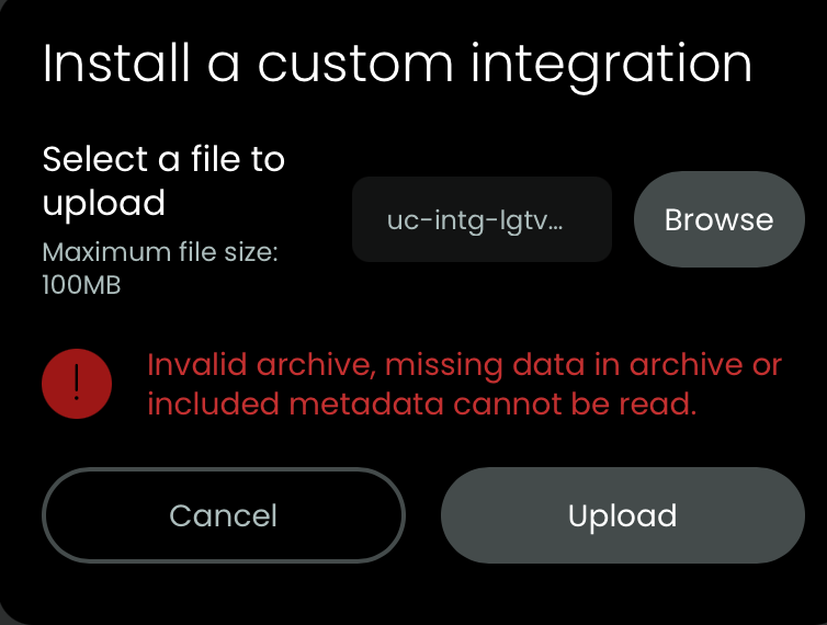Get https://github.com/albaintor/integration-lgtv/releases/download/latest/uc-intg-lgtv-v1.8.0-aarch64-20250910_143305.tar.gz and check if the file you downloaded has the axtension .tar.gz because some browser expand files during download. In the web configuration, integration select add, custom on top right and upload this file. After installation click on this new integration and choose setup. Now enter IP of TV. TV must be active and you must watch it as you has to agree twice at the LG.