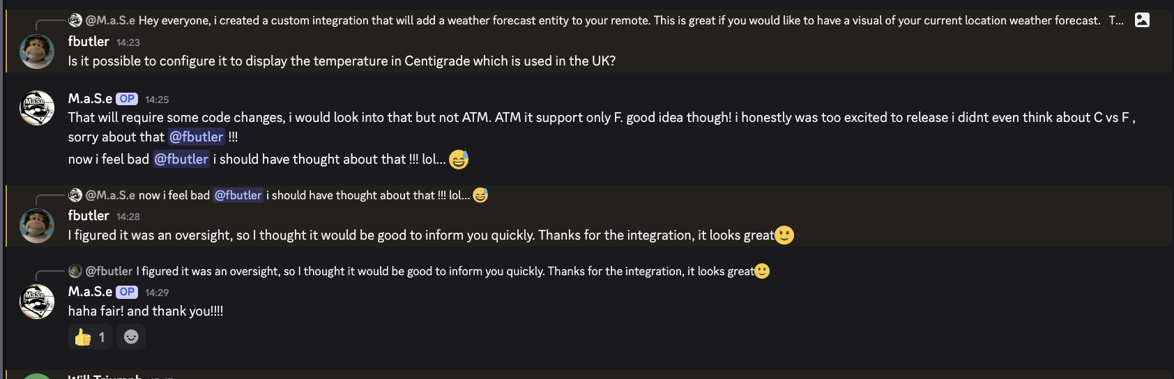 Hey @cobhc (and others) i just released a new release that have a support for Celsius as well as support for outside of us zipcode, my apologies for being so oblivious for outside US users, i was just too excited ! i hope this works, can you give it a test and report back? Release v1.1.16 · mase1981/uc-intg-weather · GitHub
