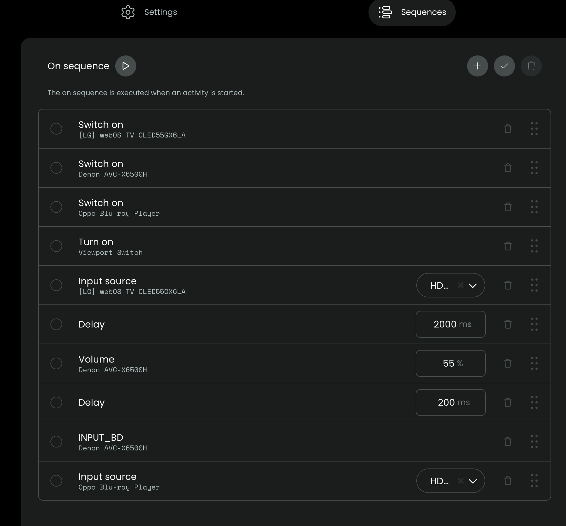 Note: Selecting input on the player can only be done when the player reports that it is on, this means that you have to place a delay between the Switch on and Input source commands if you want to use this in the On sequence, or the remote will think the start sequence fails.