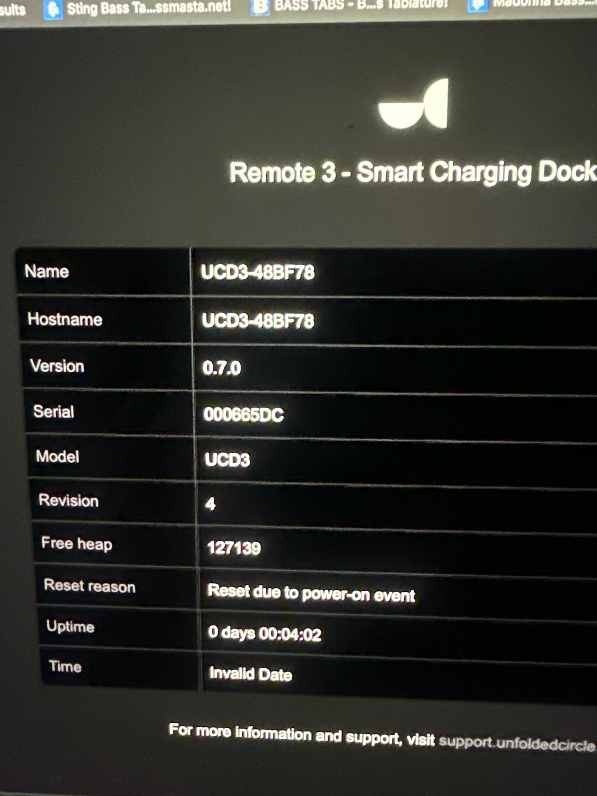 Your dock firmware is outdated and known to cause charging issues. If you can’t access the remote web configurator to update the dock firmware you can also open http://dockip/update and upload the 0.8.1 release file from here: Release v0.8.1 · unfoldedcircle/ucd3-firmware · GitHub