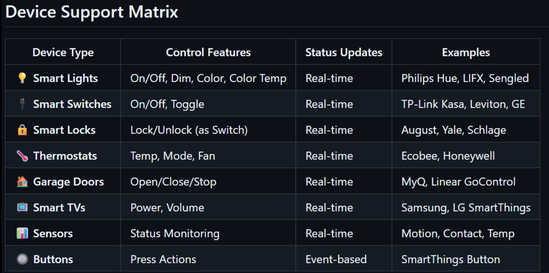 The integration automatically detects and categorizes your configured SmartThings devices (to the best of my ability to map devices)