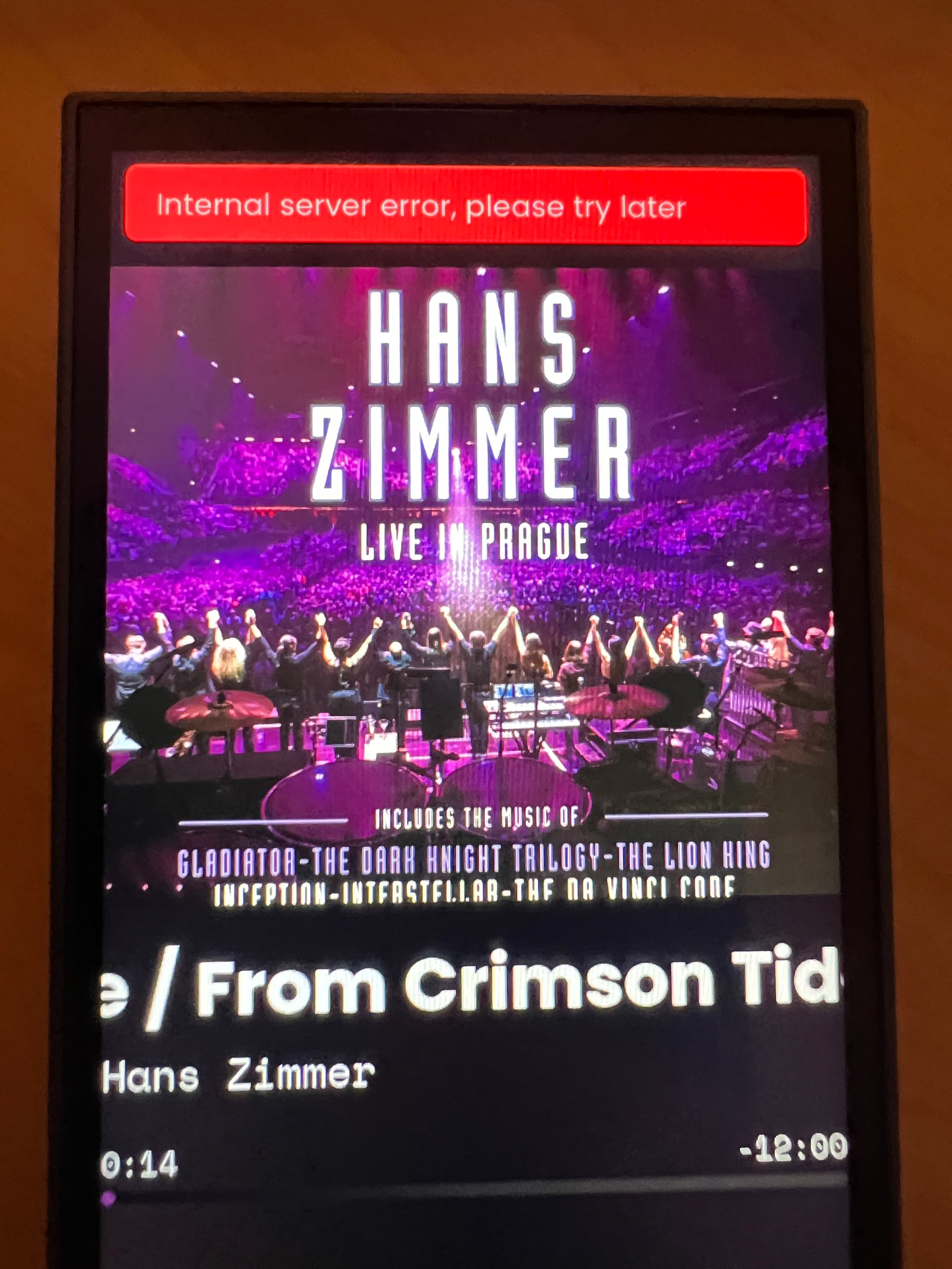 2025-11-13 17:40:03.377692 +00:00 custom-intg-spotify INFO 2025-11-13 18:40:03,375 | DEBUG | ucapi.api | [(‘127.0.0.1’, 35960)] =>: {‘kind’: ‘event’, ‘msg’: <WsMsgEvents.ENTITY_CHANGE: ‘entity_change’>, ‘msg_data’: {‘entity_id’: ‘spotify_media_player_main’, ‘entity_type’: <EntityTypes.MEDIA_PLAYER: ‘media_player’>, ‘attributes’: {<Attributes.STATE: ‘state’>: <States.PLAYING: ‘PLAYING’>, <Attributes.MEDIA_TITLE: ‘media_title’>: ‘Driving / Discombobulate / Zoosters Breakout - Live / From Driving Miss Daisy / Sherlock Holmes / Madagascar’, <Attributes.MEDIA_ARTIST: ‘media_artist’>: ‘Hans Zimmer’, <Attributes.MEDIA_ALBUM: ‘media_album’>: ‘Live In Prague’, <Attributes.MEDIA_DURATION: ‘media_duration’>: 457, <Attributes.MEDIA_POSITION: ‘media_position’>: 55, <Attributes.MEDIA_IMAGE_URL: ‘media_image_url’>: ‘https://i.scdn.co/image/ab67616d0000b27355c89e76220aeda415a01324’}}, ‘cat’: <EventCategory.ENTITY: ‘ENTITY’>}