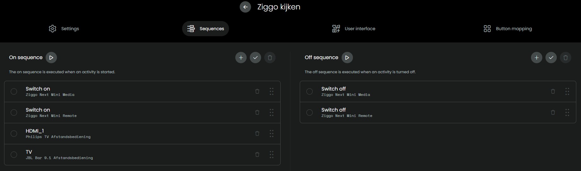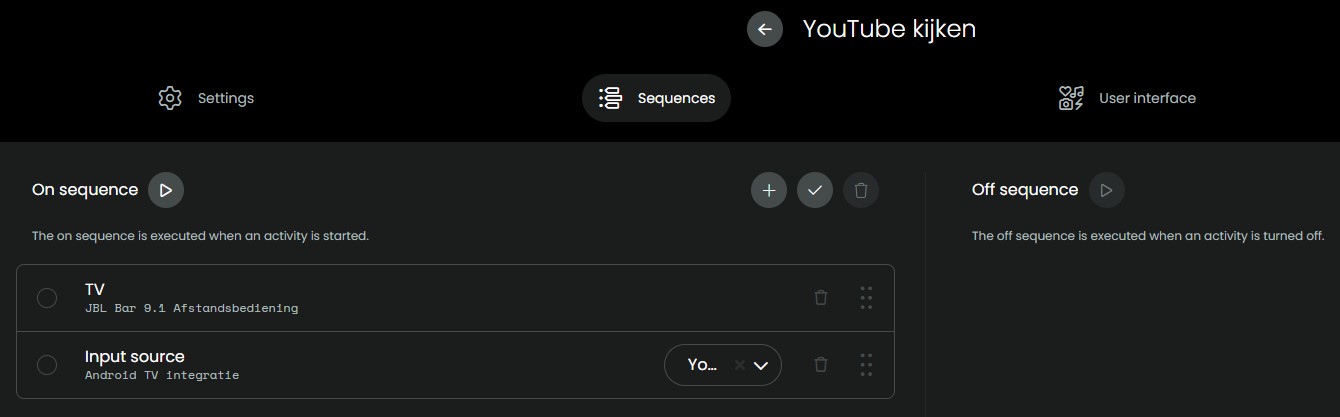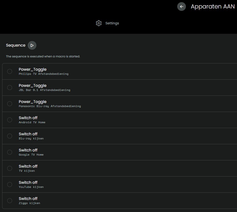 For all activities I use the Philips TV and the JBL Soundbar, I start them in the macro “Apparaten aan” and stop them in the macro “Apparaten uit”, with the power button of their remotes. So, in the activities I do not have to switch them on or off, but it looks that the Android TV integration is changed between the beta’s, which results in switching off the Philips TV.